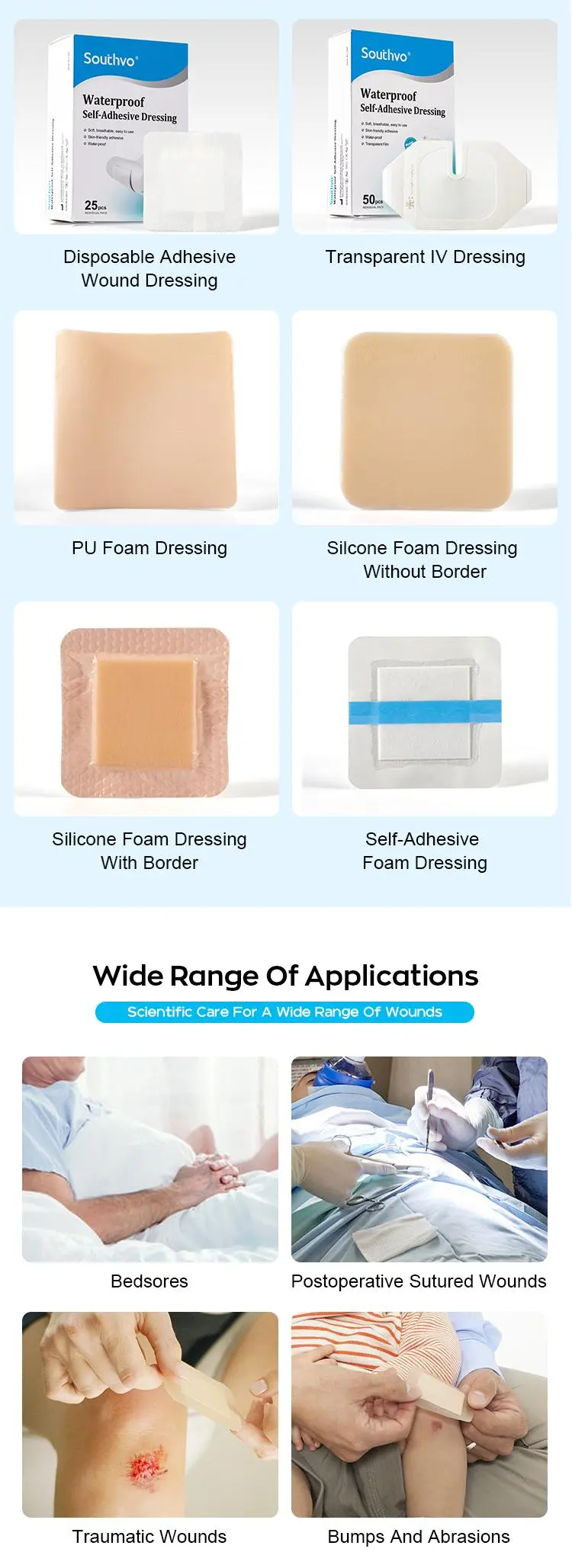Southvo foam dressing is useful for moderately to highly exuding wounds, such as post-operative wounds, sacral bedsores, pressure ulcers, diabetic foot ulcers, venous leg ulcers, neuropathic ulcers, arterial ulcers, and Ⅰ–Ⅱ degree burns.