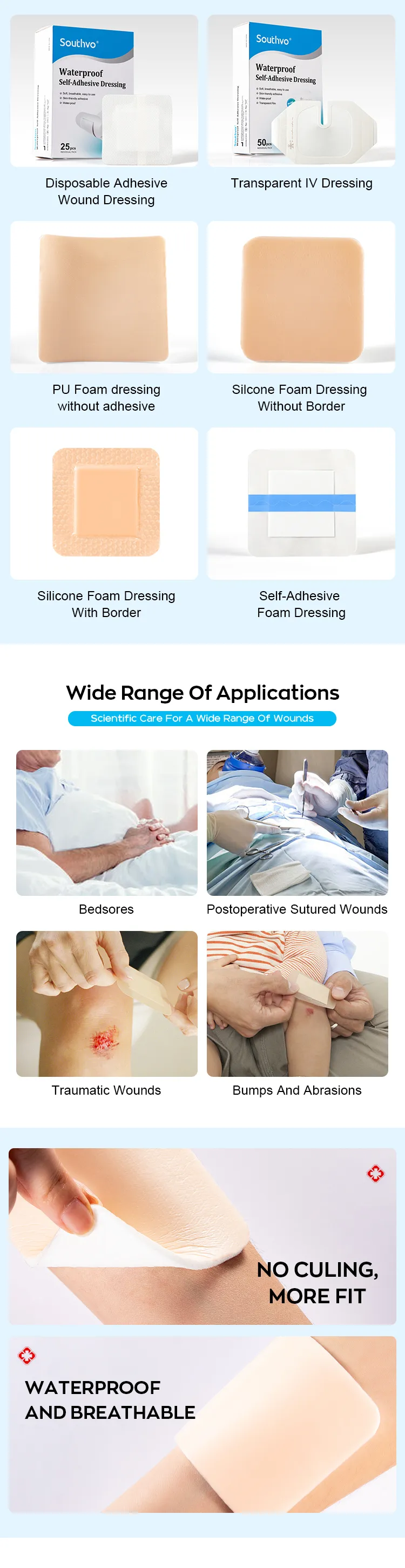 Southvo foam dressing is useful for moderately to highly exuding wounds, such as post-operative wounds, sacral bedsores, pressure ulcers, diabetic foot ulcers, venous leg ulcers, neuropathic ulcers, arterial ulcers, and Ⅰ–Ⅱ degree burns.