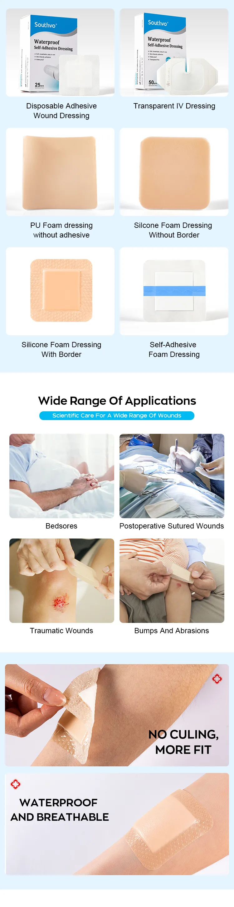 Southvo foam dressing is useful for moderately to highly exuding wounds, such as post-operative wounds, sacral bedsores, pressure ulcers, diabetic foot ulcers, venous leg ulcers, neuropathic ulcers, arterial ulcers, and Ⅰ–Ⅱ degree burns.